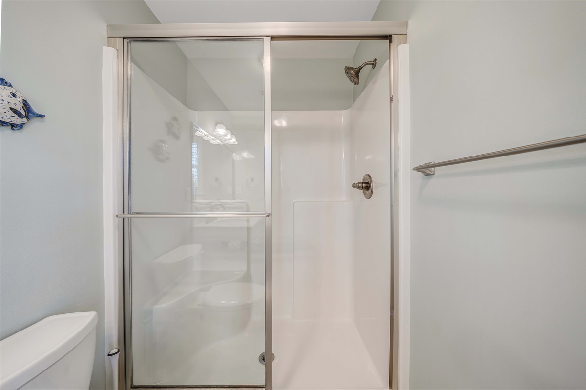The second floor has the main living area with a large open floor plan featuring a fully equipped kitchen, living room and dining area also with a large flat screen tv. . The dining room table is large and seats up to 10 people (with additional seating up to 8 at the bar). You can choose to dine outside as well on your furnished balcony and listen to the waves roll in. You can also enjoy partial beach views from the kitchen, dining, and living room as well as the balcony. On the opposite side is a beautiful king bedroom with full private en-suite bathroom with double vanity, flat screen smart tv, and french doors that lead out to your own walkout balcony overlooking the pool that also grants access to the pool. There is also a half bathroom located on the second floor.